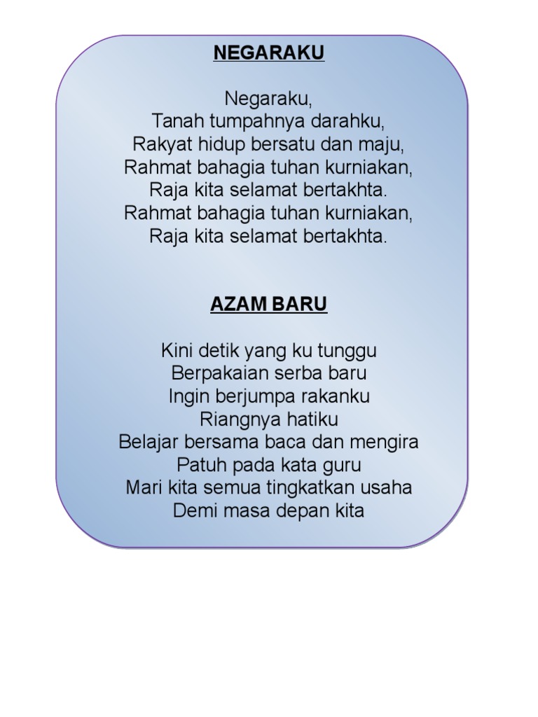 . CERITAKU Negaraku Dengarlah satu ceritaku Tanah tumpahnya darahku Seekor tikus dan lembu Rakyat hidup bersatu dan maju Tikus lincah berlari-lari Rahmat bahgia tuhan kurniakan Lembu sedih. Tugasan 4- Penilaian Kendiri. Lagu KSSR Tahun 3.